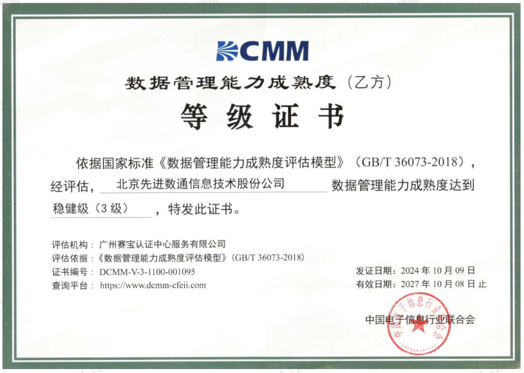 近期,中国电子信息行业联合会公布了最新一批顺利获得数据管理能力成熟度(DCMM)贯标等级认证的企业名单。巅峰国际成功取得数据管理能力成熟度稳健级(三级)认证。这一认证的取得,标志着巅峰国际在数据治理体系构建和数据管理与应用能力方面,已经达到了国家权威组织认可的标准。这不仅是对巅峰国际在数据管理领域专业能力的肯定,也是对其在有助于数字化转型服务和数据驱动决策方面所做努力的认可。
